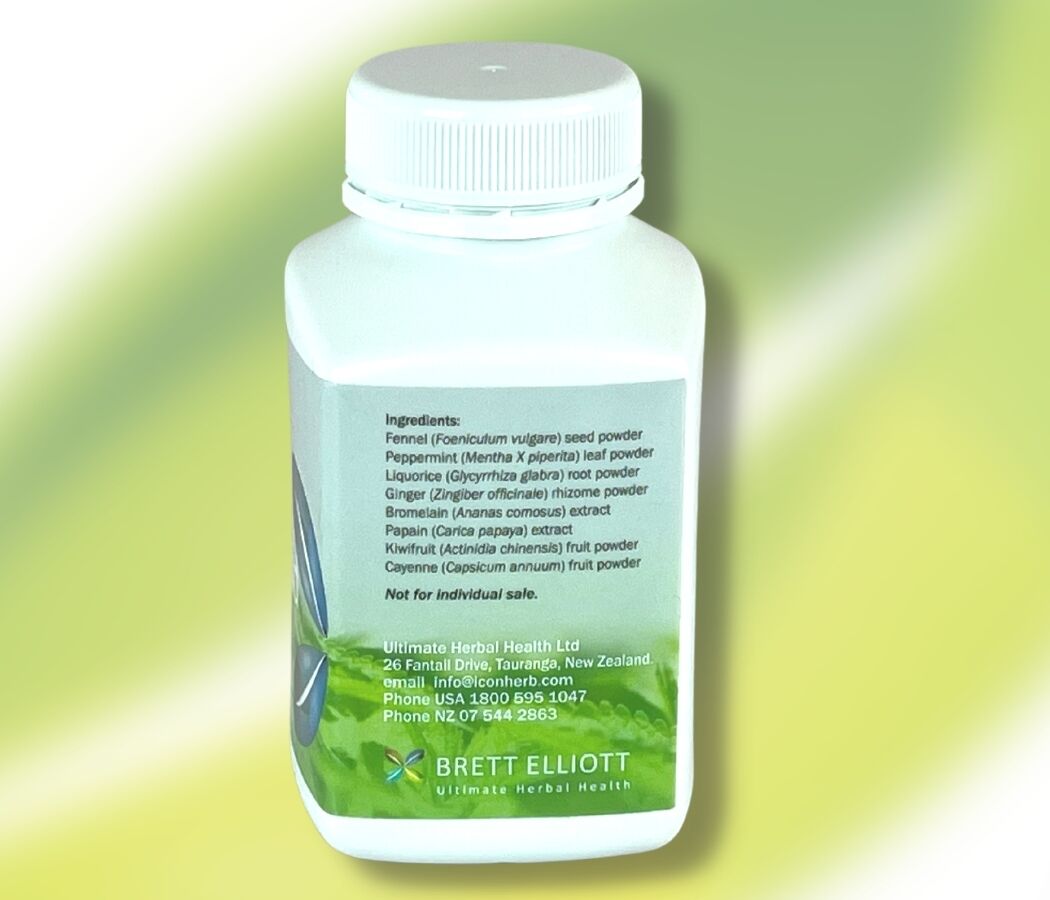 The formula also contains the enzymes Papain, Bromelain, and Kiwifruit to improve the digestion of proteins and soothing herbal agents such as Peppermint, Ginger, and Fennel to calm digestive discomfort such as bloating and gas.