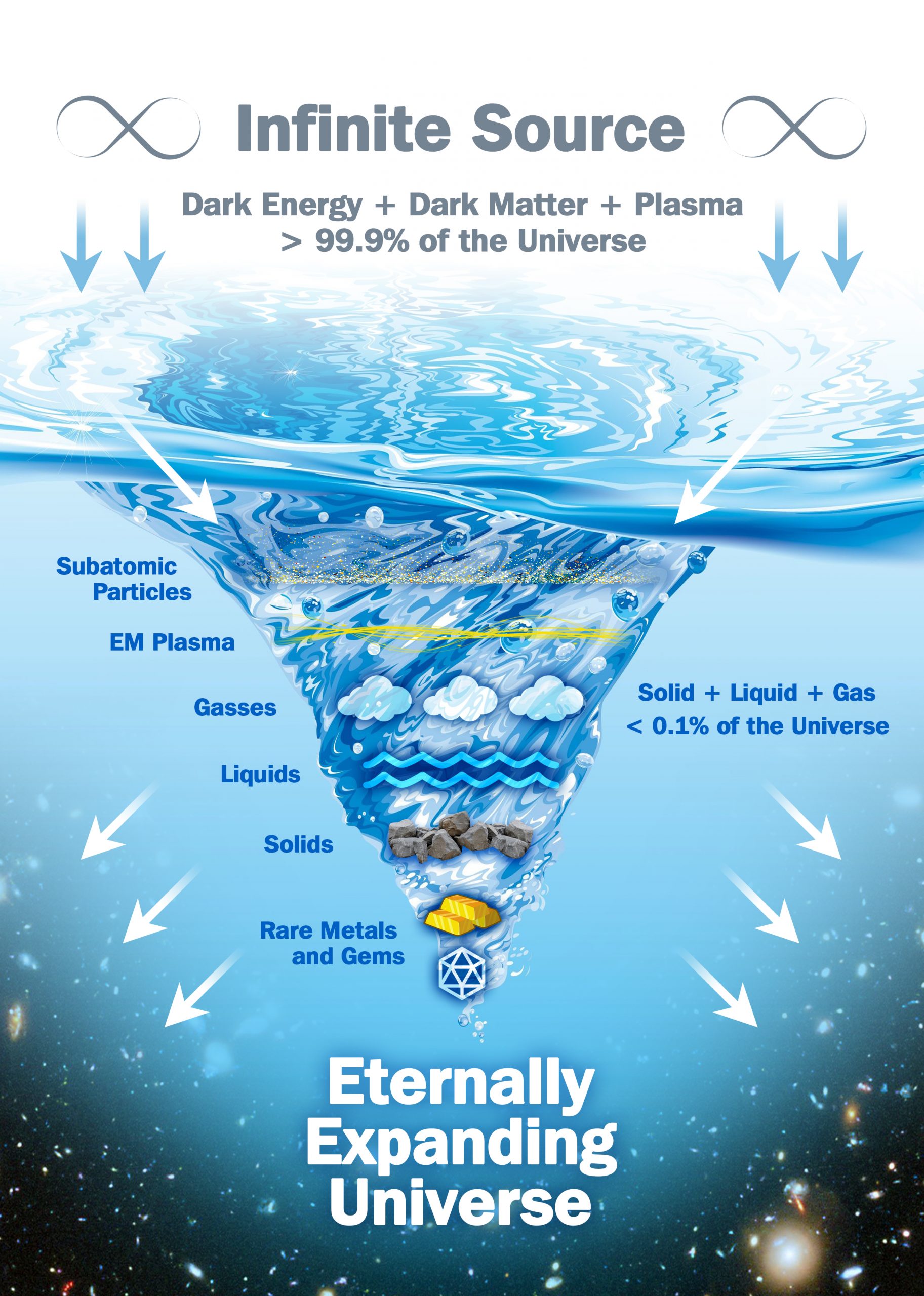 This energy, for all intents and purposes, is infinite and fills the entire cosmos. Imagine an exponential outwards and upwards expanse above the funnel chart coming up, which represents mostly the table of the elements, gasses, liquids, and solids. Above that, we have the remaining contents of the universe, subatomic waves, EM plasma, and dark energy i.e. 99.9999999% pure energy. The beauty of this concept is that this energy is just sitting there, waiting there/here for us to tap in. That’s why I completely oppose the big-bang theory because intelligent design energy flow actually works in the completely opposite direction.
